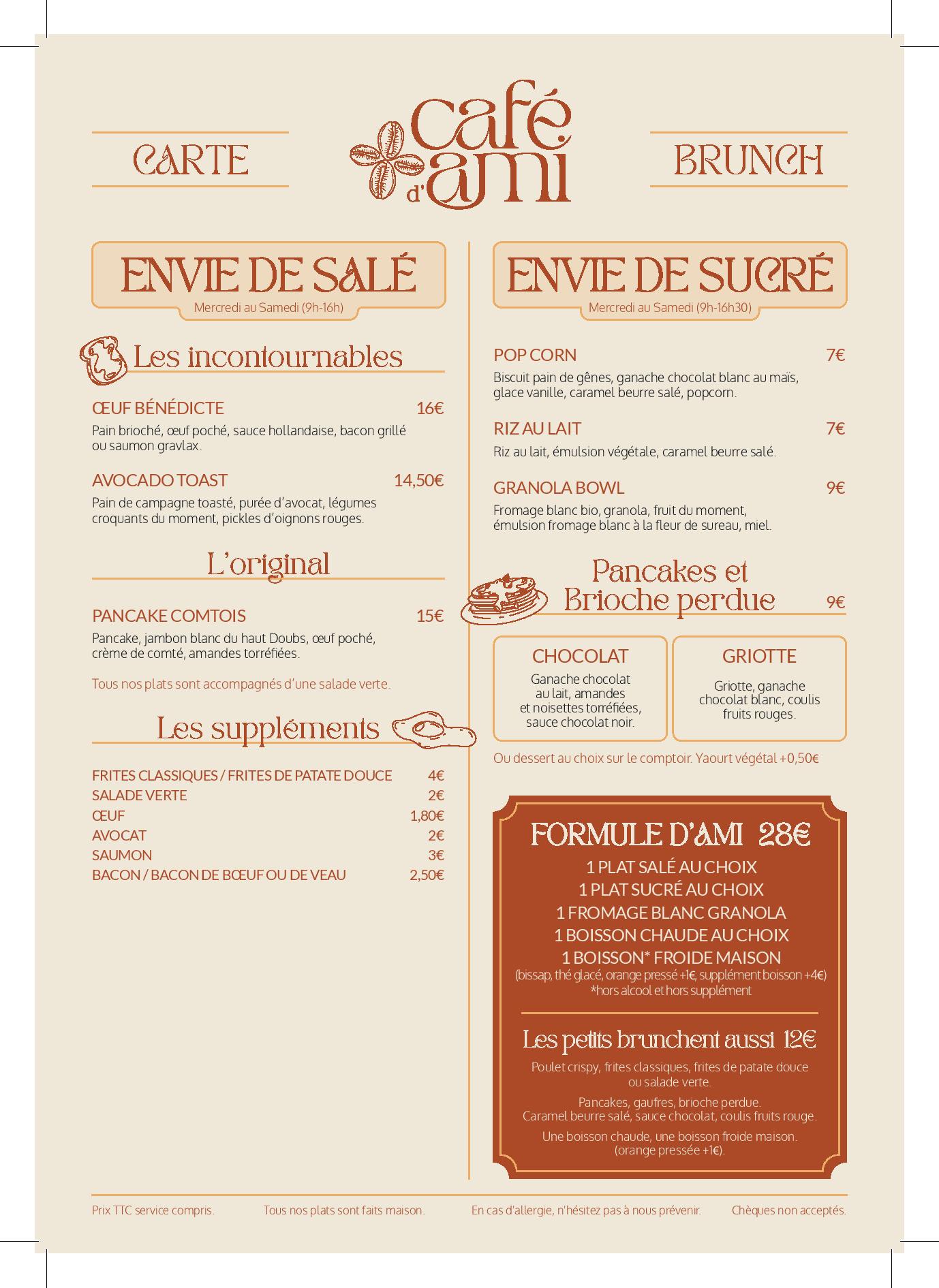 Nous vous proposons une sélection de produits à emporter, pensée pour prolonger chez vous les plaisirs gourmands du Café d’AMI. Retrouvez une partie de notre brunch à emporter, nos boissons, pâtisseries, lattés réconfortants, ainsi que le café de spécialité de la Maison Mokxa.